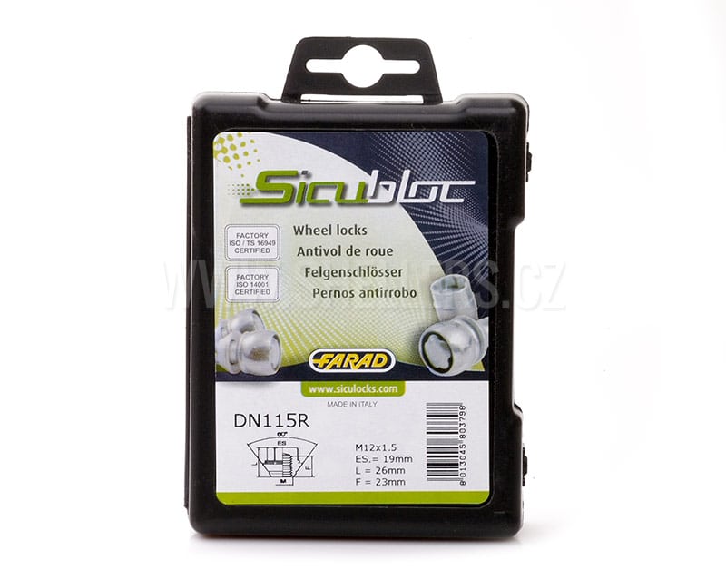 Bezpečnostní matice M12x1,5×26 mm typ SICUBLOC DN115R. Pojistné systémy FARAD, též nazývané jako zámky kol, si zakládají na dodržování nejvyšších standardů kvality. Mnoholeté zkušenosti společnosti FARAD důveřuje více než 25 významných výrobců automobilů již více než 35 let. Pojistné šrouby a matice SICUBLOC mají velmi bezpečný pojistný systém. Díky svému designu ve tvaru květiny a odolné rotační objímce velice bezpečným systémem pro každý druh litých nebo ocelových kol. Jsou vyrobeny z pevnostní pozinkované oceli a mají 20 kombinací pojistného systému. Uvedená cena je za sadu 4 kusů a jeden speciální klíč 19 mm.