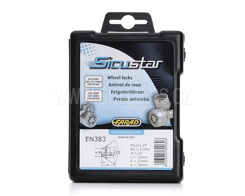 Pojistné bezpečnostní systémy FARAD, též nazývané jako zámky kol, si zakládají na dodržování nejvyšších standardů kvality. Mnoholeté zkušenosti společnosti FARAD důveřuje více než 25 významných výrobců automobilů již více než 35 let. Pojistné matice SICUSTAR M12x1,25 mm s plochou podložkou mají nejbezpečnější pojistný systém z celé nabídky. Díky odolnosti vůči zkroucení vyšší než 400Nm nemůže být rotační objímka násilím odstraněna a hlavice šroubu odolá jakémukoliv pokusu o zničení. Jsou vyrobeny z pevnostní pozinkované oceli a mají 400 kombinací pojistného systému. Barva stříbrná. Uvedená cena je za sadu 4 kusů a jeden speciální klíč 21 mm.